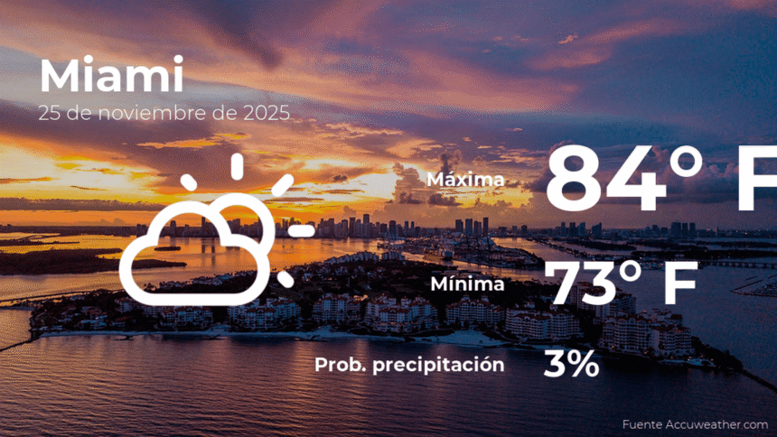 El pronóstico del clima de hoy en Miami para este martes 25 de noviembre indica que los termómetros alcanzarán un máximo de 84 grados Fahrenheit (29ºC) en la ciudad. Por su parte, la probabilidad de lluvia será del 3% y se esperan nubes escasas, mientras que las ráfagas de viento llegarán a las 10.56 mph de máxima en el día y los 8.08 mph por la noche.