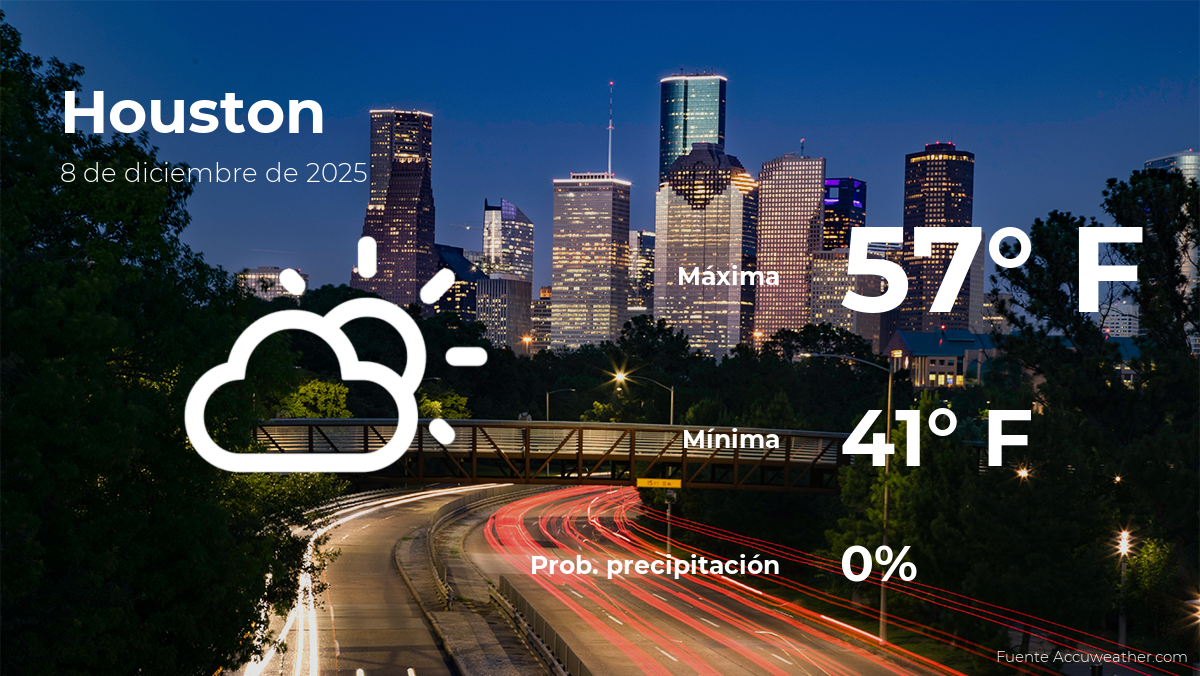El clima en Houston, Texas, para este lunes 8 de diciembre se basará en una variación entre nubes y claros. Según la última información del parte meteorológico provisto por AccuWeather, la temperatura aumentará hasta los 57 grados Fahrenheit (14ºC) de máxima durante el día, mientras que la temperatura más baja se registrará por la noche 41 grados Fahrenheit (5ºC) de mínima.