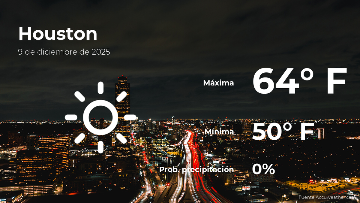 El clima en Houston, Texas, para este martes 9 de diciembre llegará con cielos sin nubes. Según la última información del parte meteorológico provisto por AccuWeather, la temperatura se incrementará hasta un total de 64 grados Fahrenheit (18ºC) de máxima durante el día, mientras que para la noche se esperan 50 grados Fahrenheit (10ºC) de mínima.